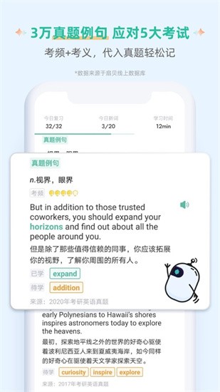 真题例句: 涵盖近四十年考研英语试题数据库,近十一年四六级试题数据库,搜索出单词释义在考题中的出现频率,高频词汇轻松掌握。